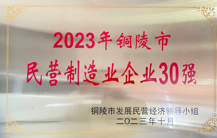 2023年11月1日銅陵市政府召開的2023年銅陵市民營企業評選活動中,我公司榮獲銅陵市民營制造業企業30強。